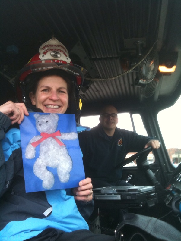 They asked if we would like to sit in their fire truck and try on a fire hat. Tidy Teddy said the hat was too big for him, but he jumped inside of it and discovered something very interesting….inside under the straps were photos of the firefighter’s family.