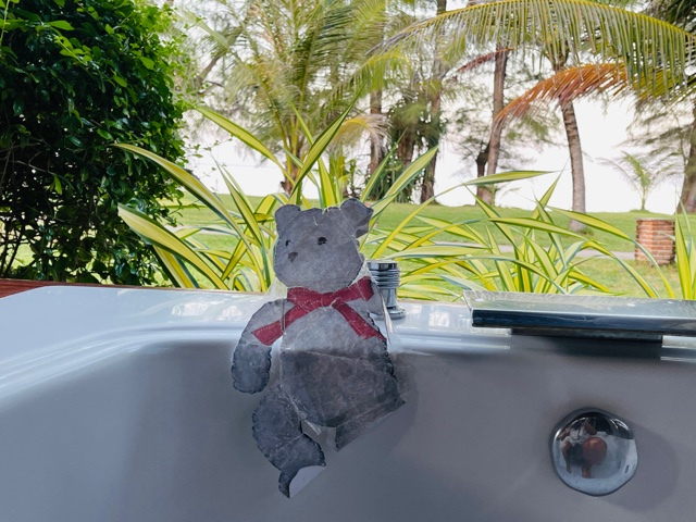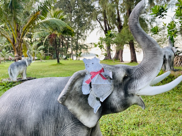 Teddy took an elephant ride and a jacuzzi this morning before saying goodbye. Although he doesn’t get out of the suitcase very often, he’s become quite travel-weary.