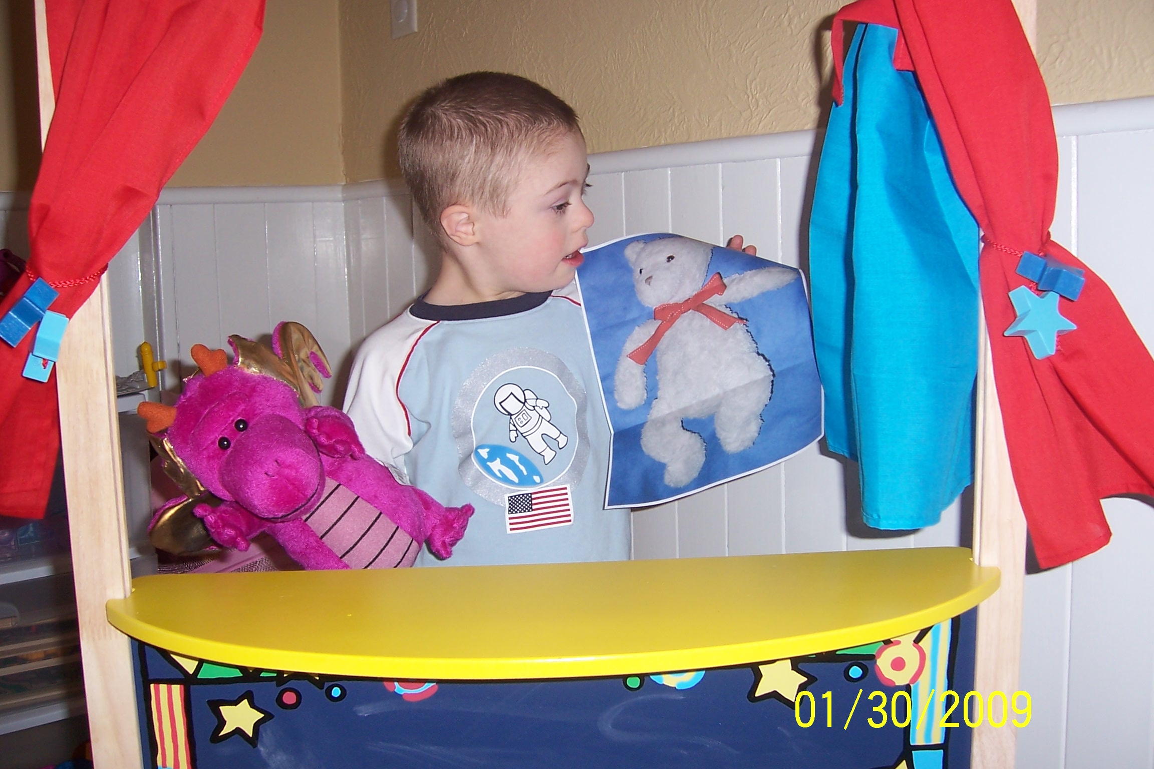 Because of the bad weather, Tidy Teddy and I started playing hide-and-seek inside. It took me thirty-four minutes to find him once. He ended up hiding in the light on the ceiling. Can you find him?